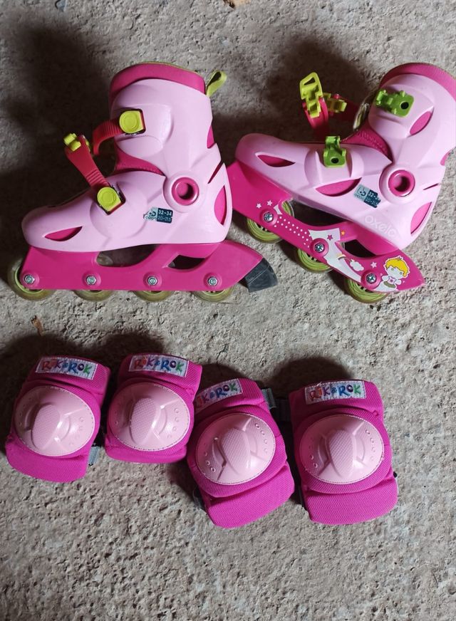 Patines de niña rosas Talla ajustable 32-34 Con rodilleras y codilleras