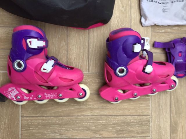 Detalles del productoSet de patines en línea para niña en color rosa y morado.