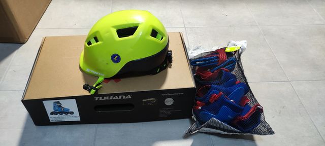 Detalles del productoPatines en línea regulables de talla 30 a 33, muy poco uso, incluyo casco regulable y set completo de protecciones. Medidas del producto