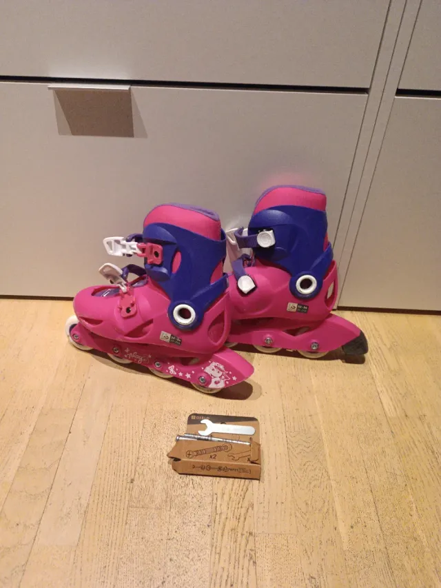 Detalles del productoPatines en línea de color rosa para niña o niño, ajustables en talla de la 32 a la 34. Incluyen herramientas para su ajuste en posición de estabilidad.