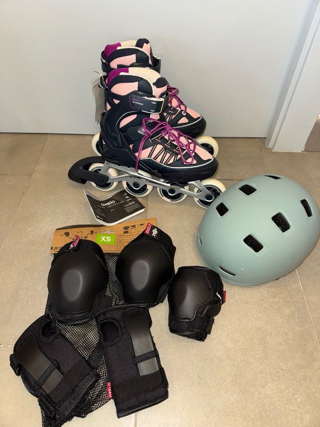 Todo está en muy buen estado y con poco uso. Ruedas, freno y cierres funcionan perfectamente. Ideal para niños/adolescentes o principiantes que quieran empezar con el equipo completo de seguridad.