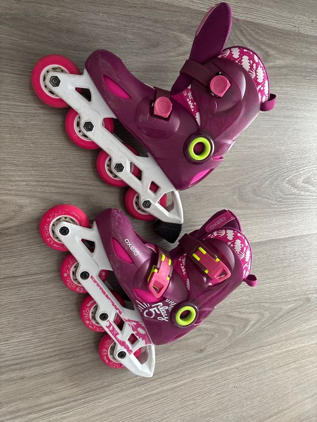 Detalles del productoPatines en línea Oxelo de color morado, ideales para iniciarse en el patinaje.