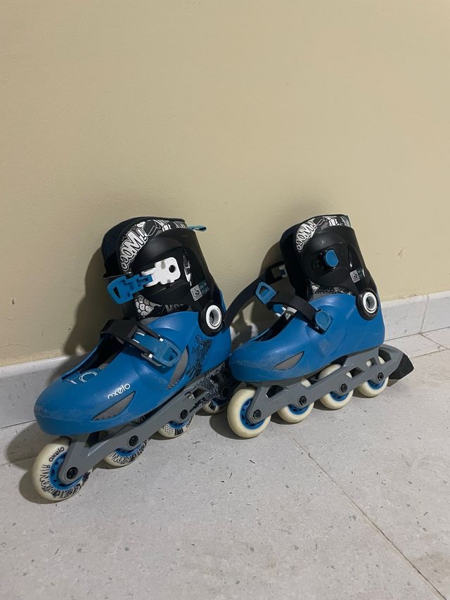Detalles del productoPatines en línea de color azul, ideales para niños. Cuentan con un diseño moderno y seguro.