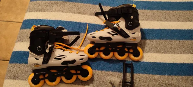 Detalles del productoSe venden patines en línea de la marca Oxelo, en color blanco con detalles en negro y cordones amarillos.