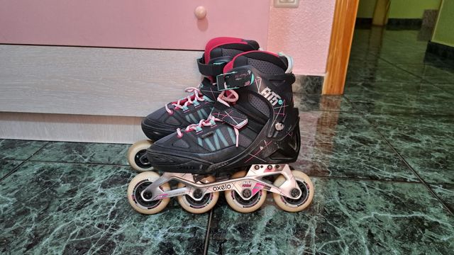 Detalles del productoPatines en línea Oxelo FIT5 en color negro con detalles en rosa y turquesa.