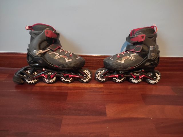 Detalles del productoSe venden patines en línea Oxelo en color negro con detalles en rojo. Son cómodos y resistentes.