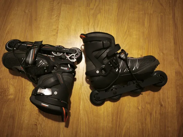 Se venden patines en línea Oxelo en color negro. Son cómodos y resistentes. - Cierre con velcro y hebilla. - Ruedas de 80mm. - Talla 45.