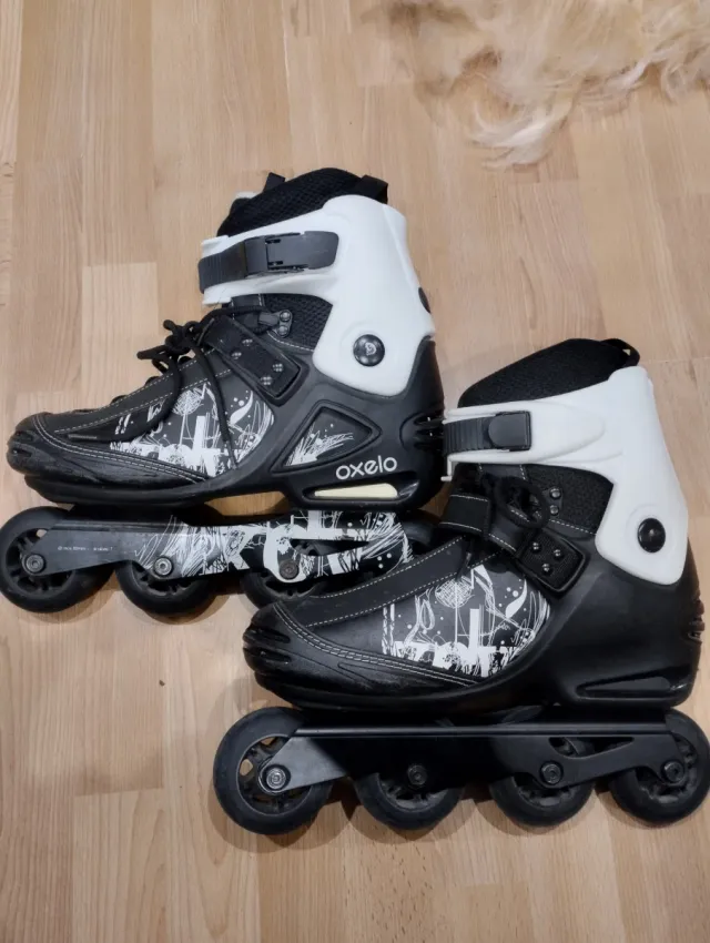 Detalles del productoSe venden patines en línea Oxelo en color negro y blanco. El diseño presenta detalles gráficos en blanco sobre el fondo negro. Tiene algún roze en la punta como se puede apreciar. Talla 45.