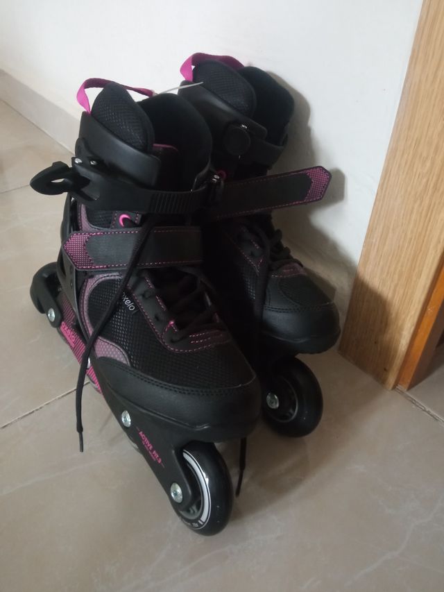 Patines en línea Oxelo en color negro con detalles en rosa. - Cierre con velcro y cordones. - Ruedas de 70 mm. - Talla ajustable. - precio negociable
