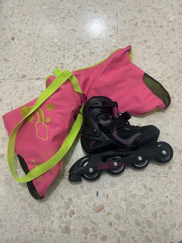 Detalles del productoSet de patines en línea Oxelo en color negro con detalles rosas, ideal para iniciarse.