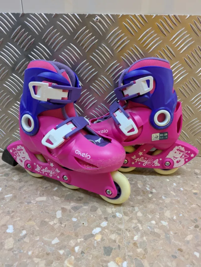 Patines en línea Oxelo de color rosa y morado, ideales para niñas. - Talla ajustable 26-28. - Cierre con hebillas. - Ruedas de poliuretano.