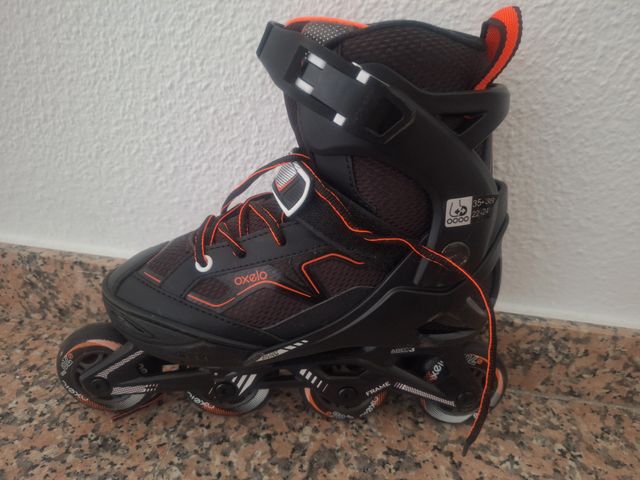 Patines en línea Oxelo para niño, talla 35-38. - Color negro con detalles naranjas. - Cierre con velcro y cordones. - Ruedas de 70mm.