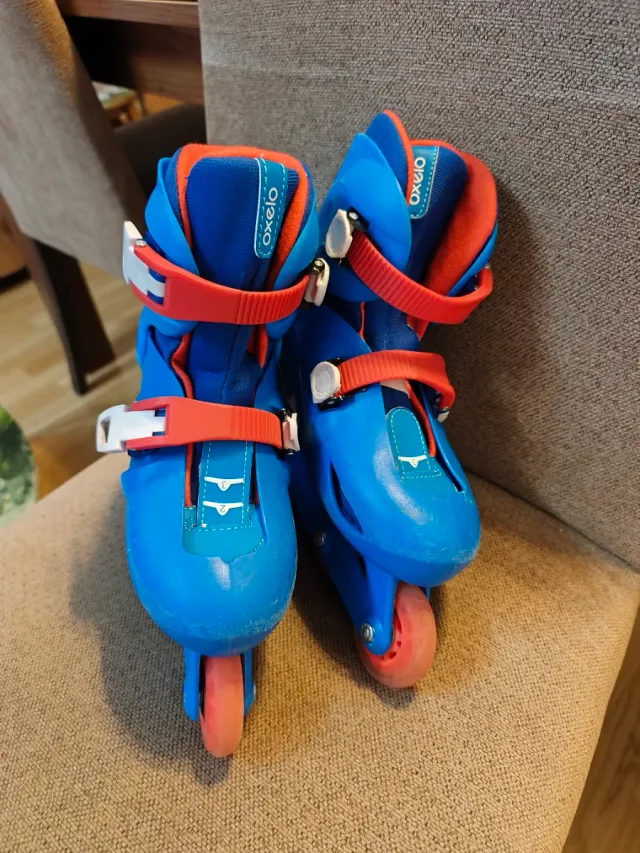 Detalles del productoPatines en línea Oxelo de color azul y rojo, diseñados para niños. Cuentan con cierres de velcro y hebilla para un ajuste seguro. Incluye protecciones de manos, codos y rodillas.