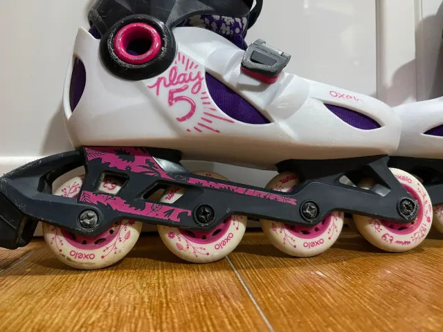 Detalles del productoPatines en línea Oxelo Play 5 para niños, con un diseño blanco y morado.