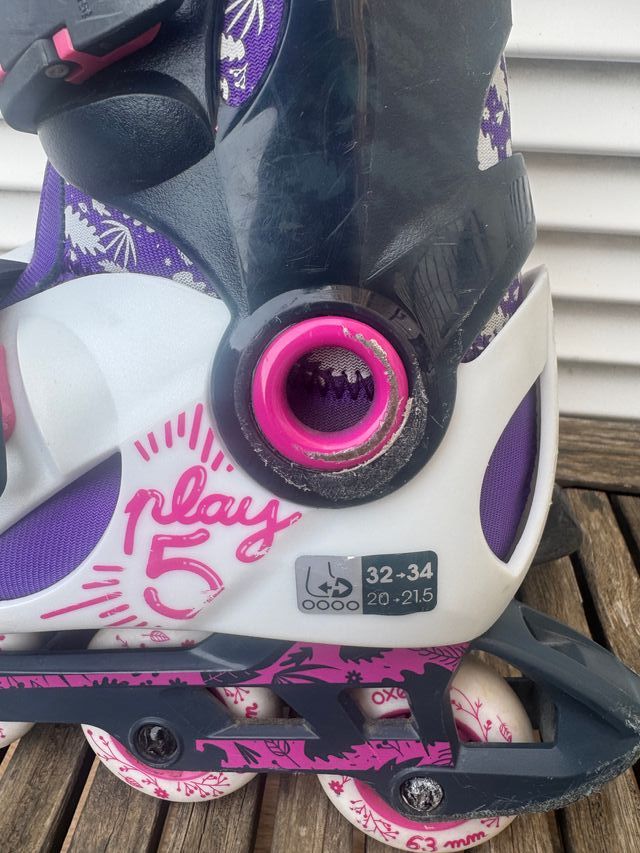 Detalles del productoPatines en línea Oxelo Play 5 en color blanco, morado y rosa. Perfectos para iniciarse en el patinaje. Con algún desperfecto en el plástico por el uso (rayado)
