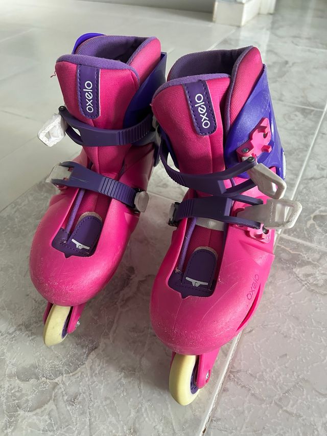 Patines en línea de la marca Oxelo en color rosa y morado. - Diseño deportivo. - Cierre de velcro y hebilla. - Ruedas de patinaje. - Talla 34-36