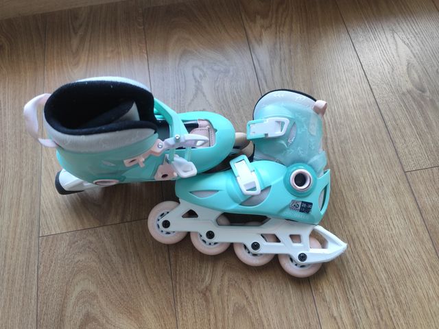 Detalles del productoPatines en línea de la marca Oxelo, ajustables para tallas de 28 a 31. Color turquesa con detalles en rosa y blanco.