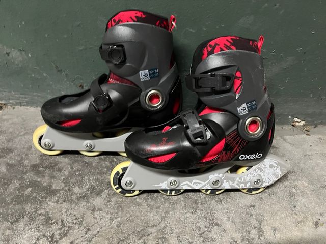 Patines en línea infantiles de la marca Oxelo, talla 32-34. - Diseño en color negro y rojo. - Cierre con velcro y hebilla. - Ruedas de color amarillo.