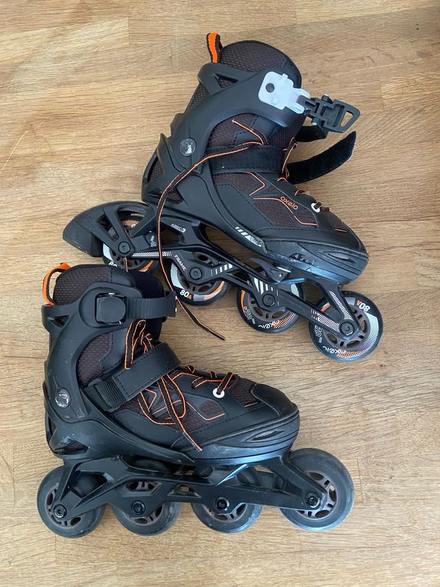 Detalles del productoPatines en línea Oxelo en color negro y naranja, talla 36-38. Perfectos para iniciarse en el patinaje.