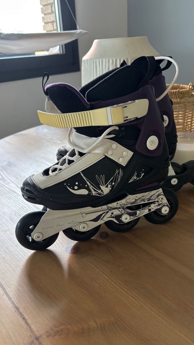Detalles del productoPatines en línea de la marca Oxelo, con un diseño llamativo en morado y negro.