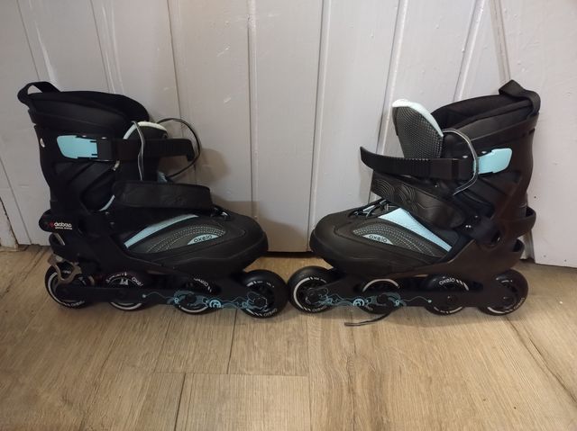 Detalles del productoPatines en línea Oxelo de color negro y detalles en azul claro. Perfectos para desplazamientos y ocio. Sólo estrenados. Número 41. Incluyo bolsa de transporte y rodilleras