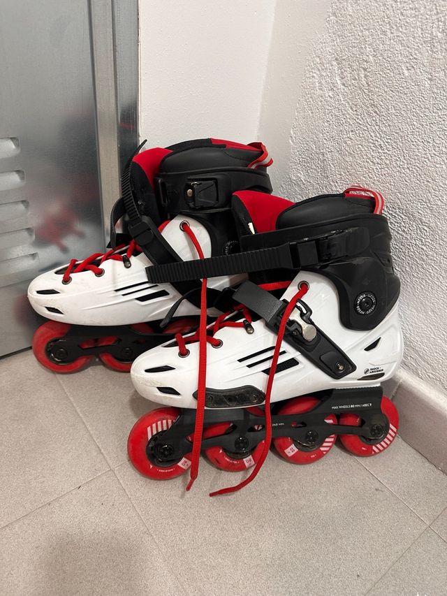 Detalles del productoPatines en línea marca OXELO de talla 44, en colores blanco, negro y detalles en rojo. estado impecable.