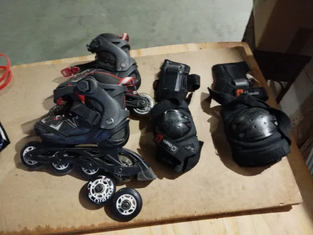 Set de patines en línea Oxylone con protecciones. - Patines en línea negros y rojos. - Incluye rodilleras y muñequeras. - Ruedas de patín adicionales.