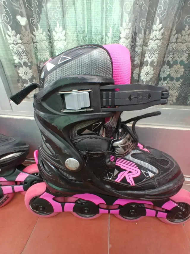 Detalles del productoPatines en línea de color negro y rosa, diseñados para niñas. Cuentan con un sistema de cierre de hebilla y cordones para un ajuste seguro.