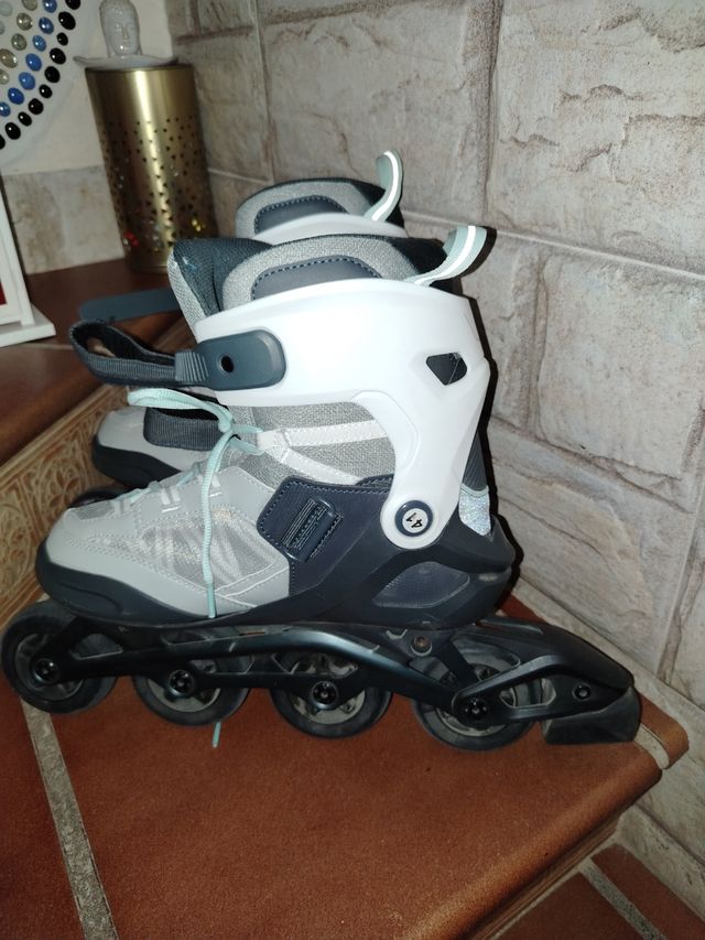 Detalles del productoPatines en línea de color gris y blanco, ideales para iniciarse en el patinaje.