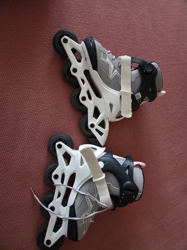 Patines en línea en color gris y blanco. - Cierre de velcro y cordones. - Ruedas de goma. - Bota acolchada. - talla 32-35 - incluye bolsa de transporte