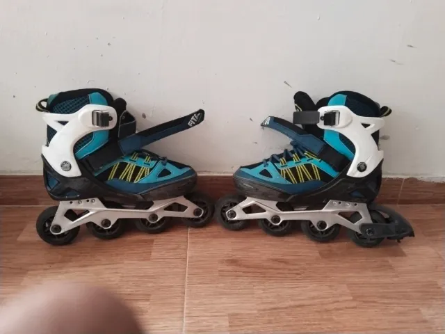 Detalles del productoPatines en línea de color azul y negro, diseñados para niños. Cuentan con un sistema de ajuste.