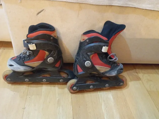 Se venden patines en línea, ideales para iniciarse en el patinaje. - Diseño en color rojo y negro. - Cierre de velcro y cordones. - Ruedas de poliuretano.