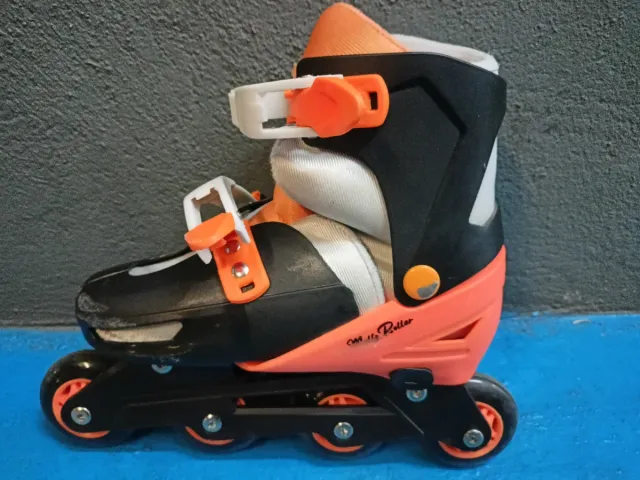 Detalles del productoPatines en linea naranjas y negros con dos posiciones de entrenamiento y una posición de experto de 4 ruedas en linea. Talla M y ajustables de número 35 a 38, perfecto para niños a partir de 5 años.