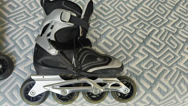Patines en línea con un diseño moderno en color plateado y negro. - Ruedas de poliuretano. - Cierre de velcro y hebilla. - Bota acolchada para mayor comodidad.