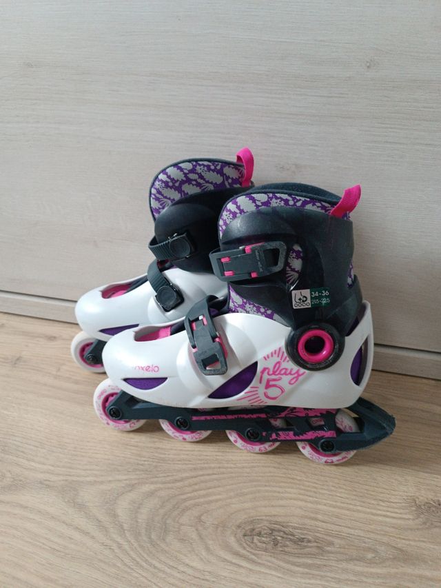 Detalles del productoPatines en línea Play 5, talla 34-36 (215-225 mm). Ideales para niñas. Están en buen estado, con algunos signos normales de uso.