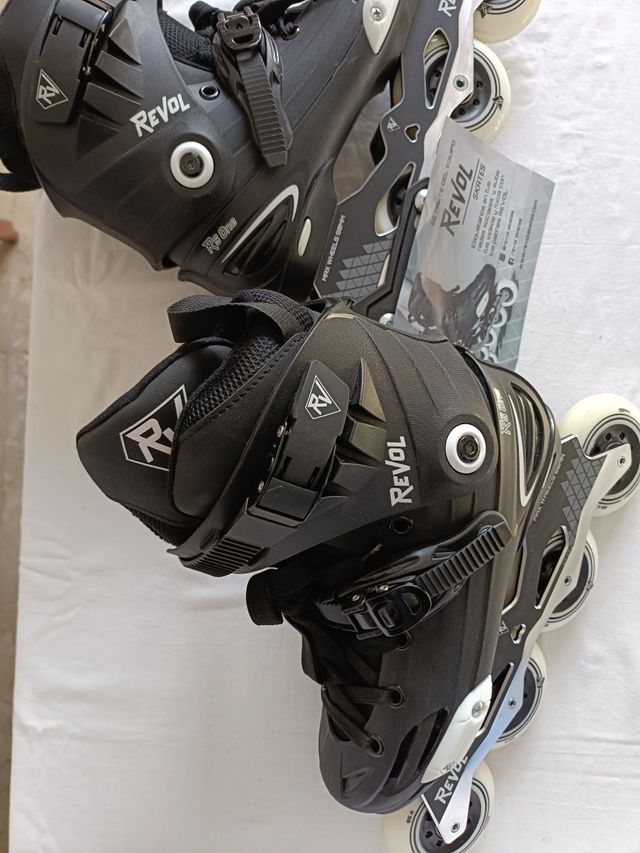 Patines en línea REVOL, ideales para patinaje. - Color negro. - Ruedas de 60mm. - Cierre de hebilla y velcro. Usados una vez. Regalo protecciones.