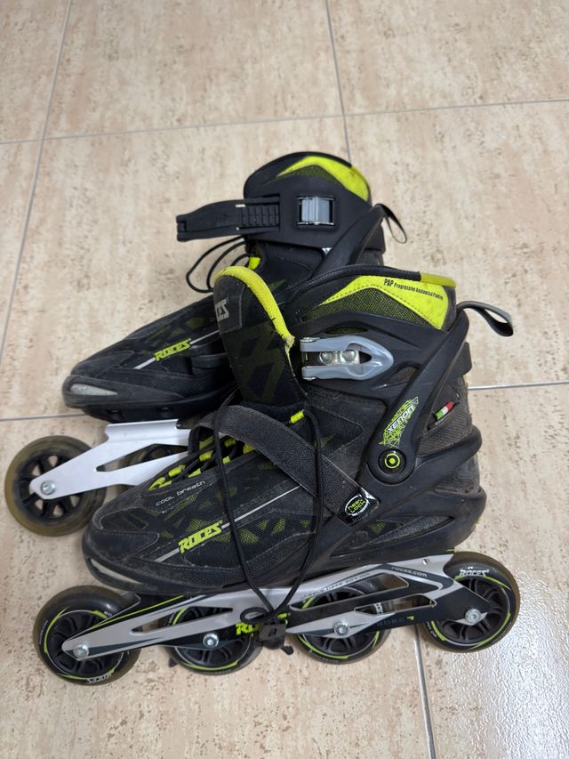 Patines en línea de la marca Roces en color negro y detalles en amarillo. - Cierre de carraca y velcro. - Ruedas de 80 mm. - Botín interior acolchado.