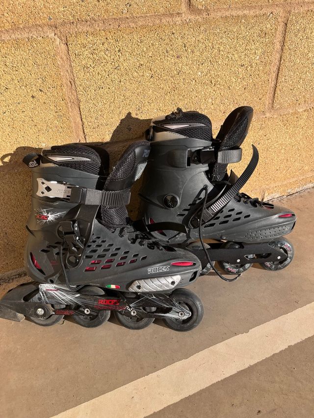 Patines en línea Roces X35 en talla 44. - Color negro con detalles en rojo. - Cierre de velcro y hebilla. - Ruedas Roces.
