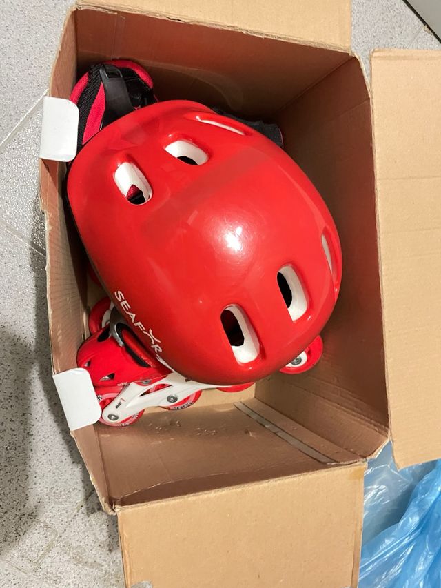 Set de patines en línea de color rojo, ideales para iniciarse en el patinaje. Incluye casco protector. - Patines ajustables. - Casco rojo con ventilación.