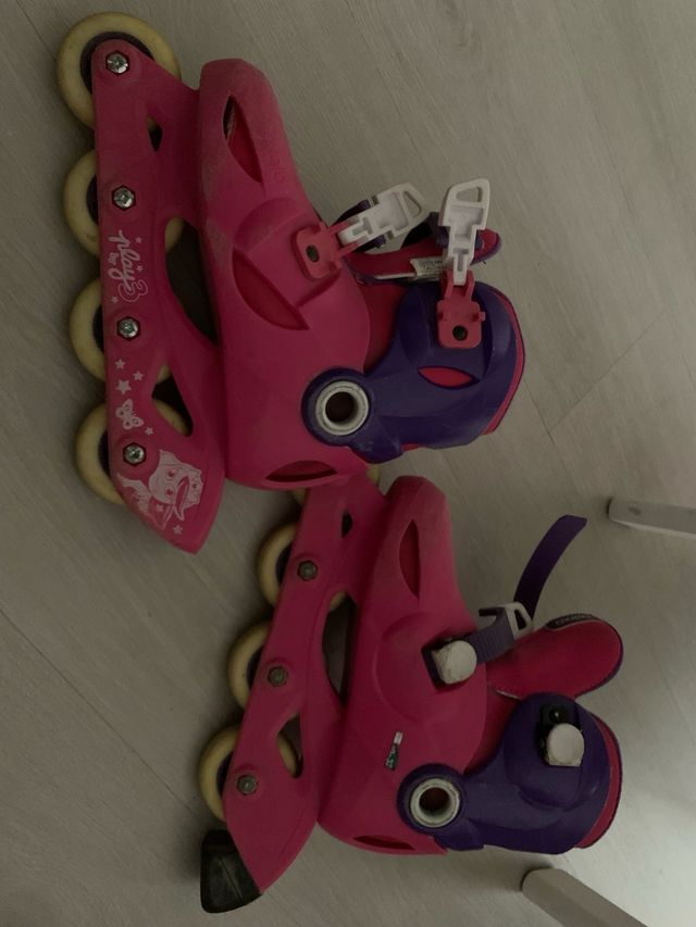 Detalles del productoPatines en línea de color rosa y morado, diseñados para niñas. Cuentan con un sistema de cierre de hebilla y velcro para un ajuste seguro.