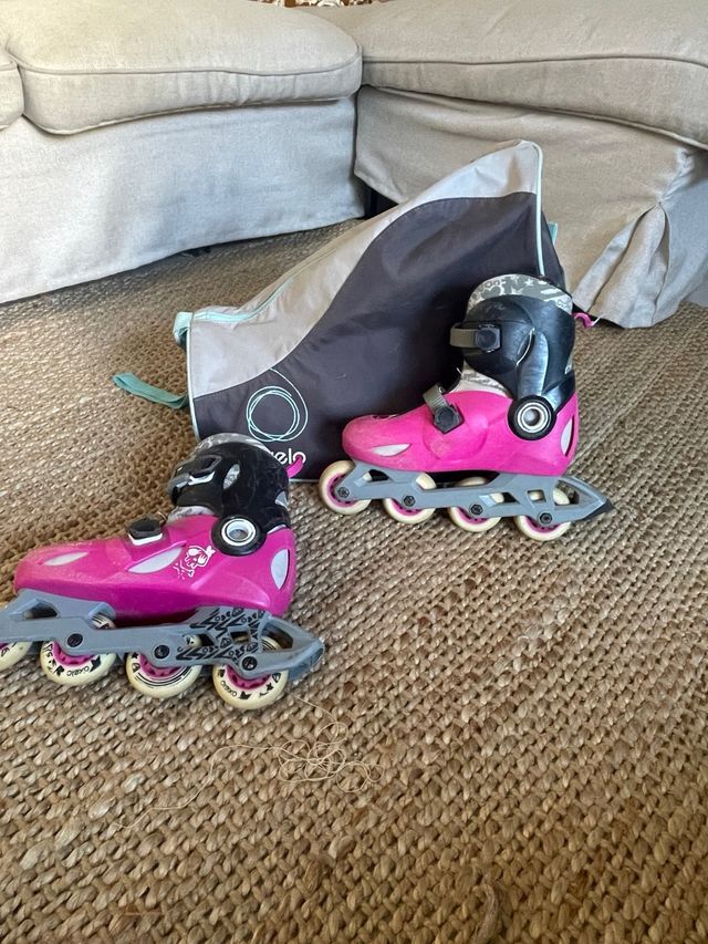 Detalles del productoSet de patines en línea de color rosa, diseñados para niñas. Incluyen una bolsa de transporte.