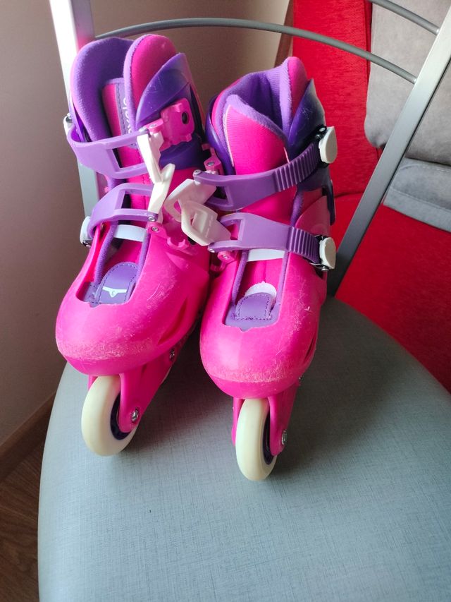 Patines en línea de color rosa y morado, perfectos para deslizarse. - Cierre de velcro y hebilla. - Ruedas de color blanco.