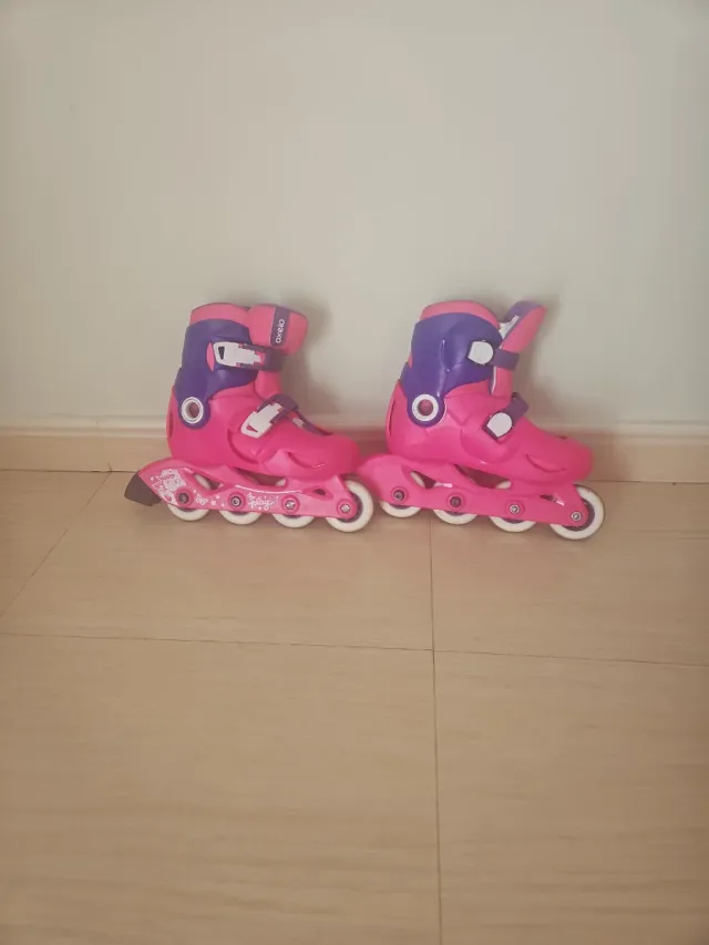 Detalles del productoSet de patines en línea para niños, con un diseño llamativo en color rosa y morado.