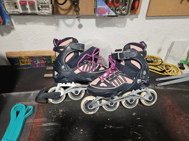 Detalles del productoPatines en línea con un diseño deportivo y llamativo en color rosa y negro.