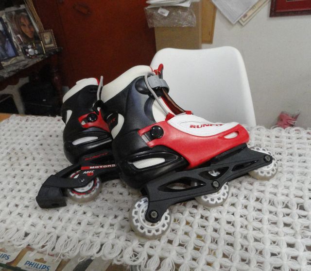 Patines en línea de la marca Runfit, ideales para iniciarse en el patinaje. - Talla ajustable de 35 a 38. - Diseño en color negro y rojo. - Ruedas ABEC.