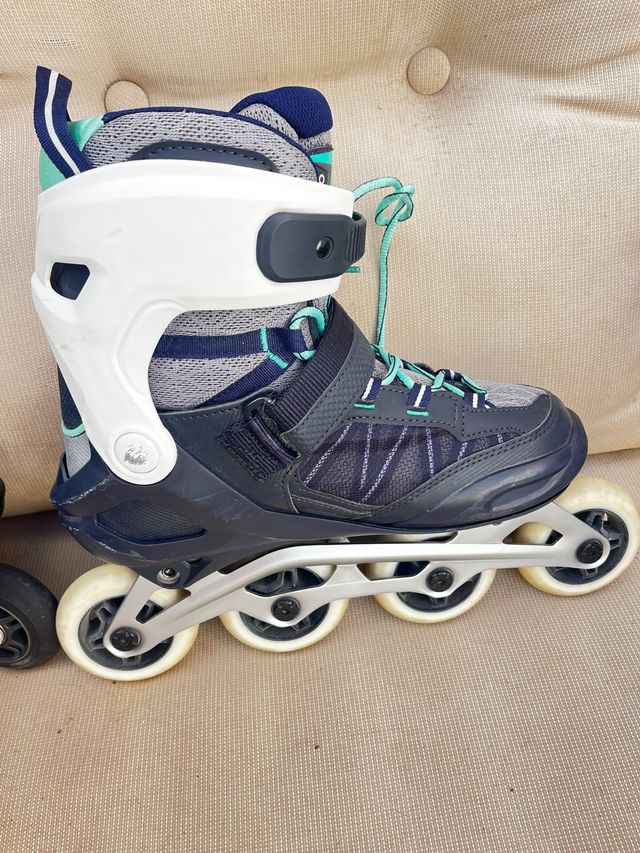 Patines en línea en buen estado, listos para usarse. - Diseño moderno en azul, gris y blanco. - Cierre de velcro y cordones. - Ruedas de poliuretano.