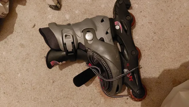 Patines en línea de color gris y negro. - Ruedas de color rojo. - Cierre de velcro y cordones.