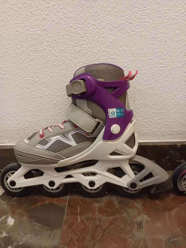 Patines en línea ajustables para niños. - Talla: 32-35. - Color: Gris y morado. - Cierre de velcro y hebilla.