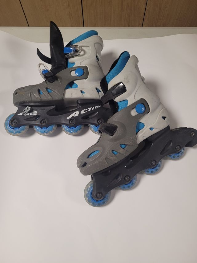 Detalles del productoPatines en línea de color gris y azul, ideales para iniciarse en el patinaje.