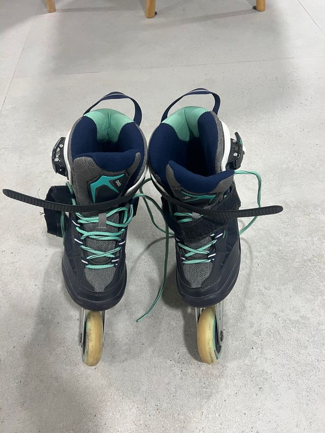 Patines en línea en color gris, azul marino y verde menta. - Cierre con cordones. - Cierre de velcro. - Ruedas de patinaje.